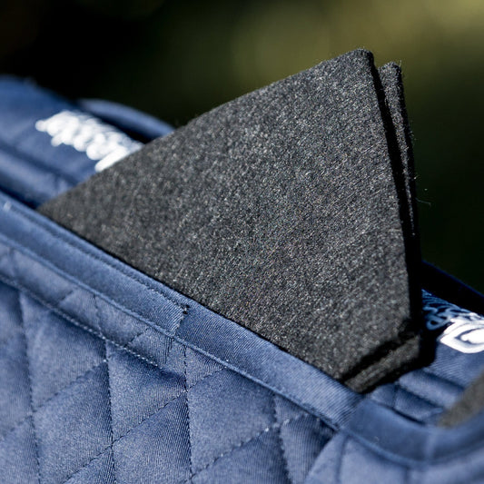 Shop the LE Performance Saddle Pad range here. Choose from Dressage or Jump style both in either classic navy or bright white. Each of Performance Saddle Pad with Shims comes with front and rear pockets, with two shims per pocket so you can adjust as needed. Do check with your saddlefitter.