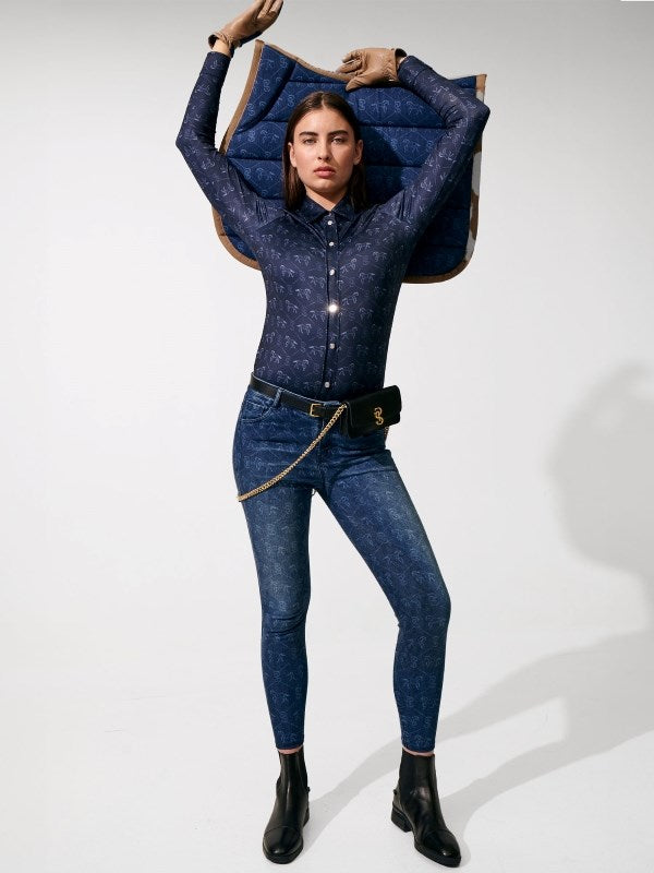 Denim breeches in same quality as our best-selling Maggie and Ellie but with a lighter contrast all over pattern with PS logo and running horses.
